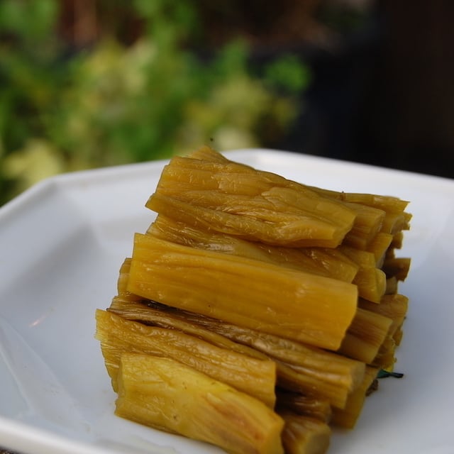 古漬用に漬け込みし、3ヶ月以上しっかり乳酸発酵させて山吹色になった物はコリコリっとした歯応えと独特の酸味が特徴です。